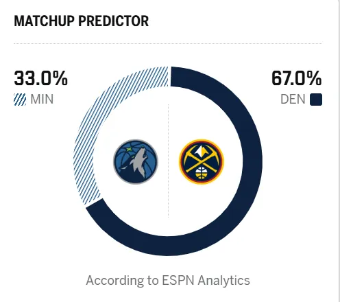 ESPN预测明日季后赛:掘金胜率67.0%,森林狼胜率33.0%